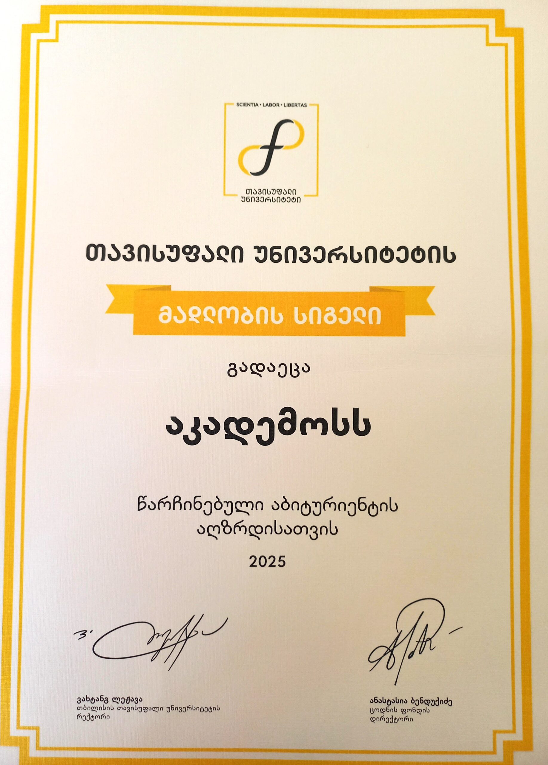 “თავისუფალი უნივერსიტეტის” ტრადიციად ქცეული მადლობის სიგელი სკოლა “აკადემოსს”. ჩვენთვის ყველაზე დიდი საჩუქარი სწორედ ის მადლობაა, რომელსაც ჩვენ მიერ აღზრდილი მოსწავლეების წარმატების შედეგად ვიღებთ.